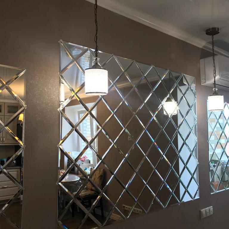 Использовалась серебристая зеркальная плитка формы "вытянутый ромб".